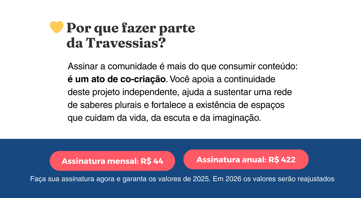 A Travesssias vem na contramão da aceleração e hiper individualismo acentuado pelas redes sociais. Aqui, cultivamos diálogos vivos entre diferentes saberes e práticas que desafiam o modelo dominante. Abrimos espaço para conversas profundas, para ouvir o diferente e se conectar com pessoas que compartilham das mesmas angústias e delícias de criar um futuro mais regenerativo.